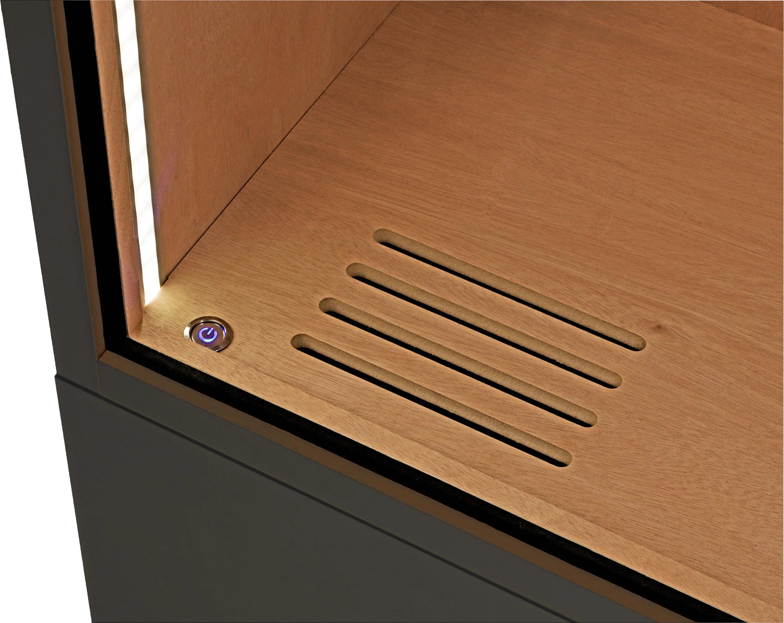 A very attractive cabinet humidor of the highest quality. What I particularly like is the continuous glass door without a frame. Inside, it’s very customizable. The cabinet is placed in my living room and serves as an excellent focal point. And finally, there's enough space to store many different types of cigars. The humidification system works flawlessly as well. I recommend an additional hygrometer (also available at HumidorDiscount) to measure the humidity in the upper section, not just in the storage drawer. It's worth the price, a great piece. A quick note on delivery: it arrived in one piece via freight, and it worked perfectly for me.