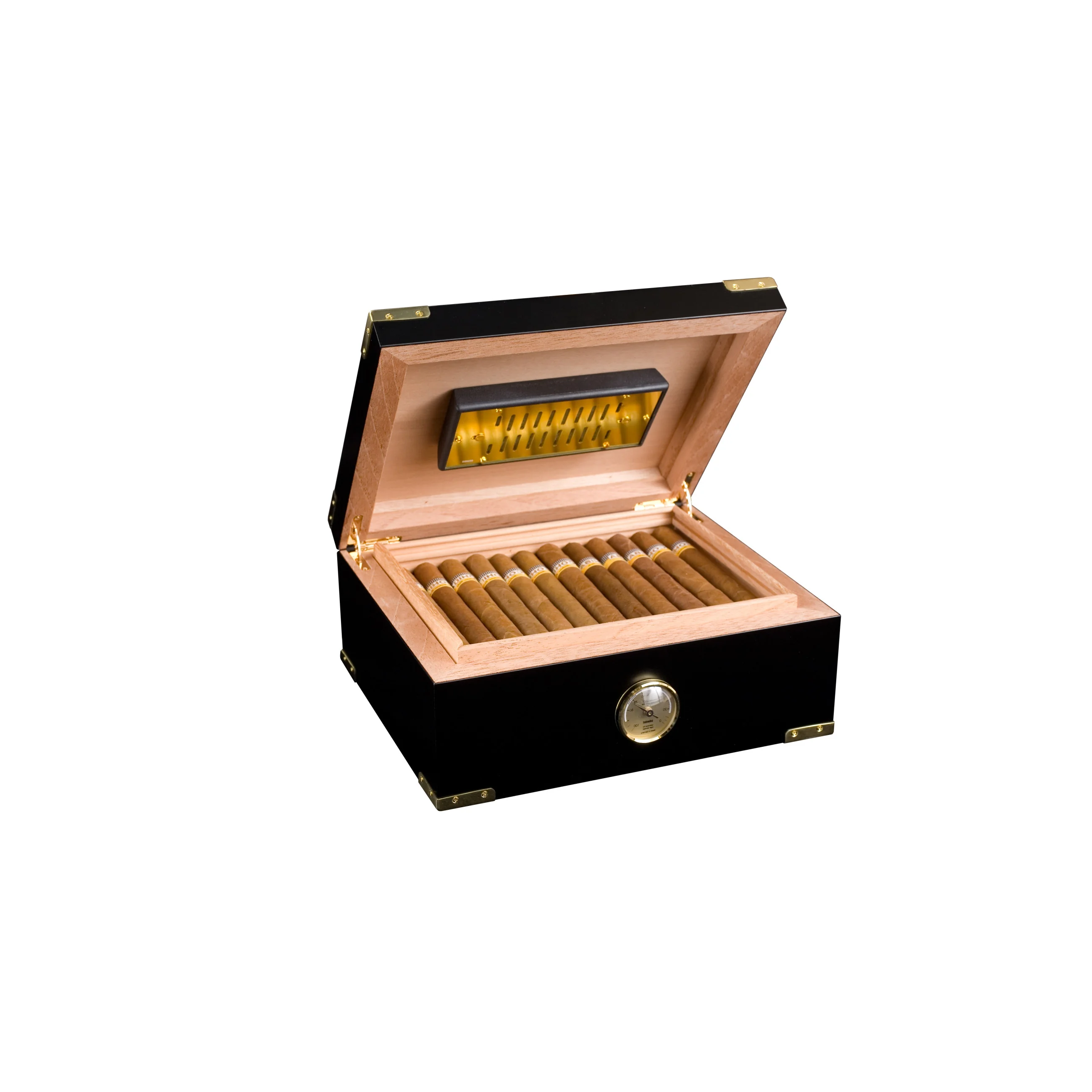 安道里尼豪华镀金丙烯酸聚合物湿度计可以高效调节最多75 支皇冠(Corona)大小的雪茄 。这款精心打造的珍品含可调节的通风孔,能够将湿度水平调整到最适合你的雪茄的范围内。湿度计通过磁铁以及雪松木板下方的金属板吸附在盖子下方,以优化空间利用率和湿度管理。