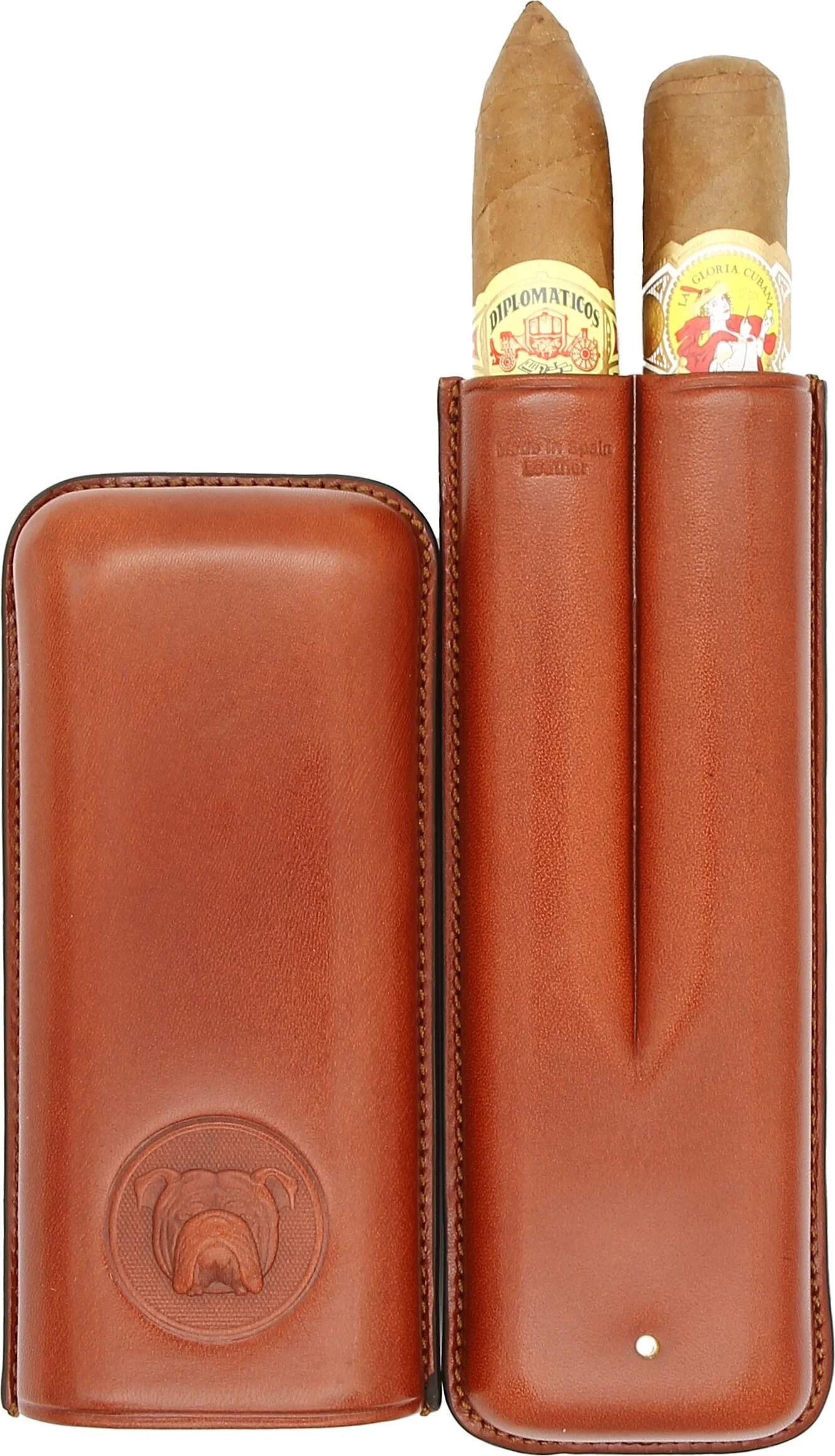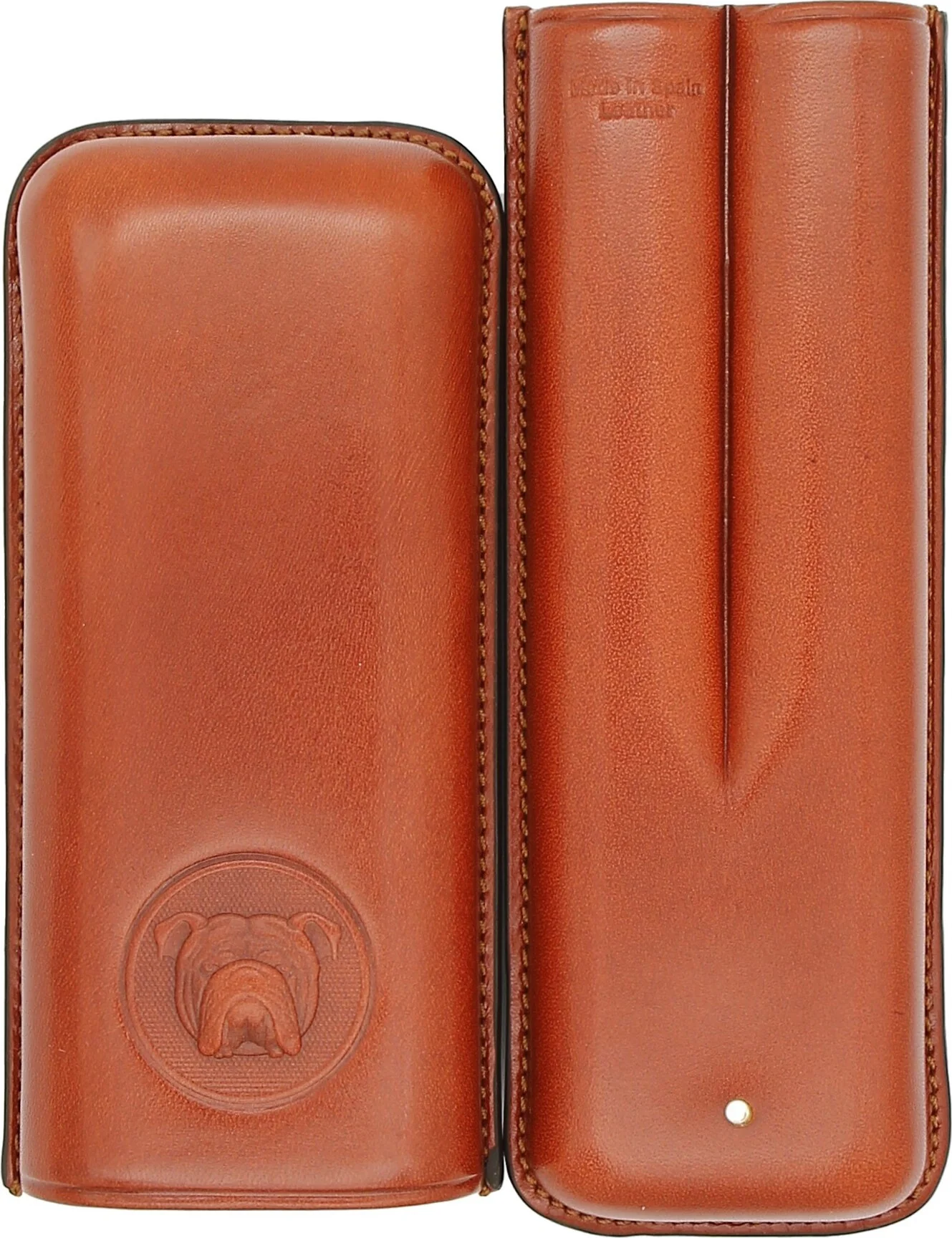 The Bulldog by Dunhill Cigar Case Corona, in a sophisticated brown color reminiscent of cognac, combines elegance and robustness in a high-quality accessory. Crafted from genuine leather and made in Spain, it impresses with classic craftsmanship and a striking design.