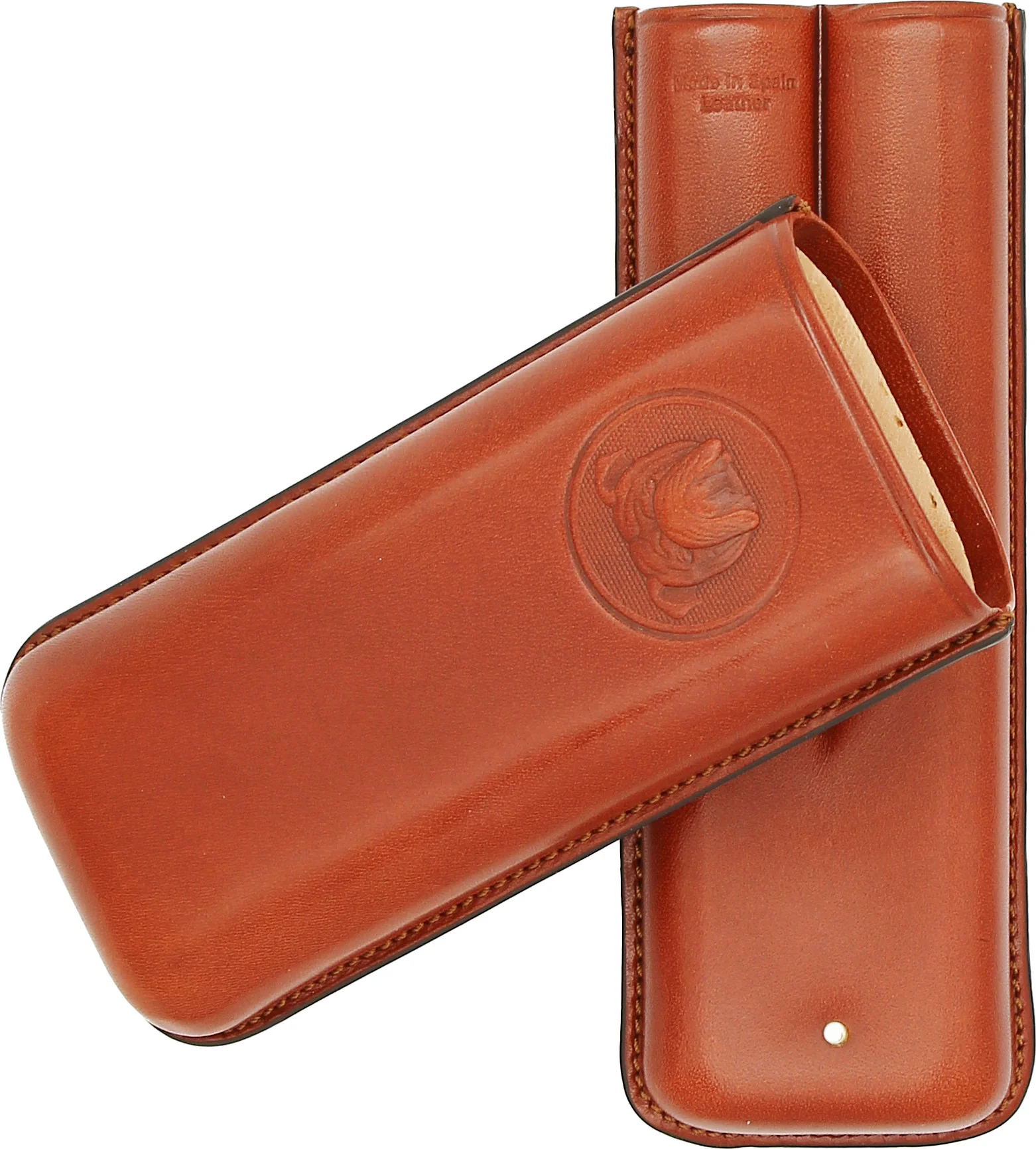 Inside, the case offers space for two cigars of different sizes. Practical notches ensure secure hold during transport. The interior is lined with soft, light-colored leather and reliably protects the cigars.