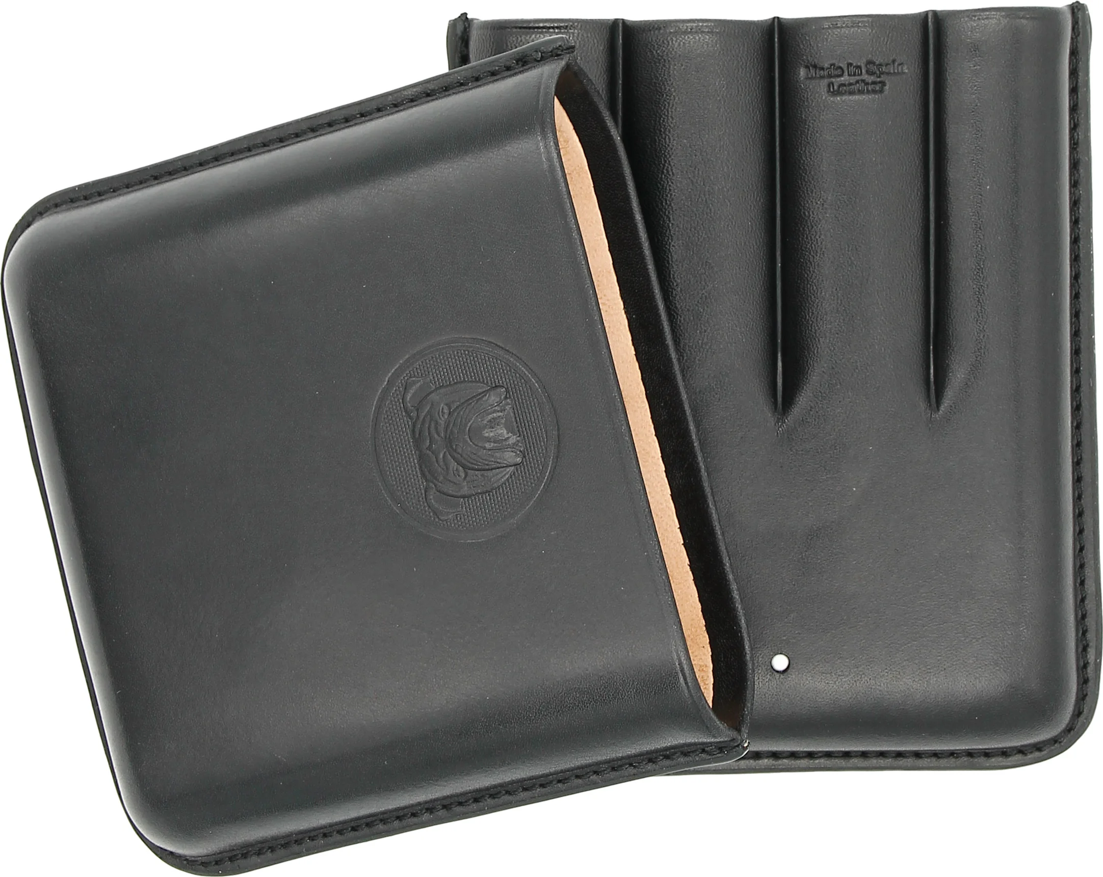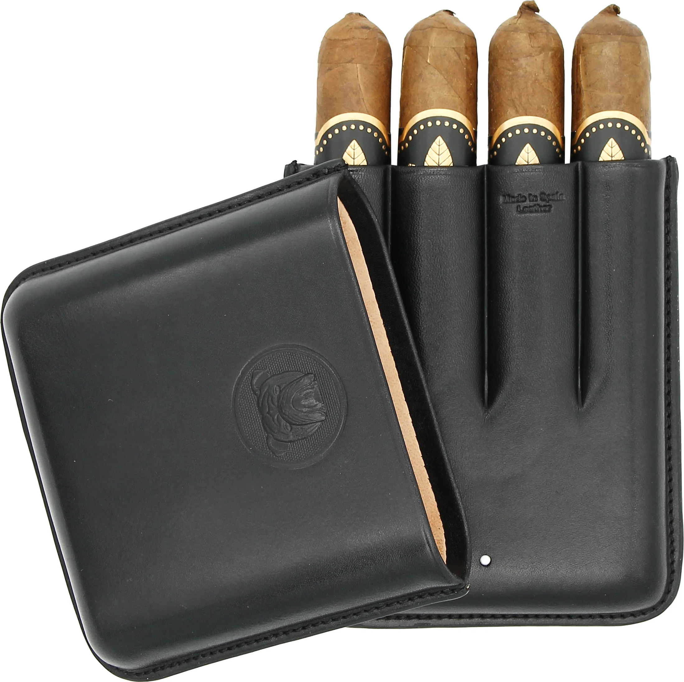 Inside, the case offers space for four cigars of different sizes. Practical notches ensure secure hold during transport. The interior is lined with soft, light-colored leather and reliably protects the cigars.