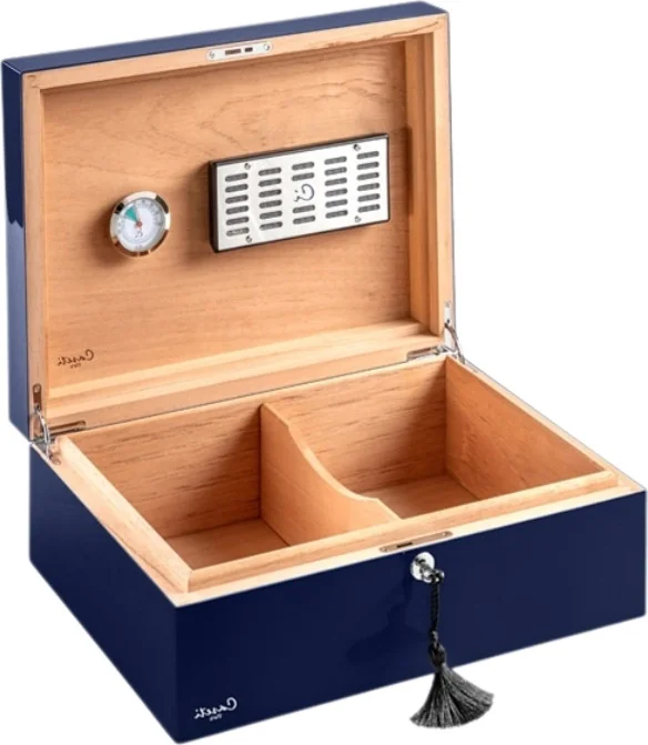 这款保湿盒的表面涂层特别厚实,赋予其玻璃般的质感——仿佛木质盒身被一层透明玻璃密封起来。对于追求风格的雪茄爱好者而言,它绝对是一款吸睛之作。
