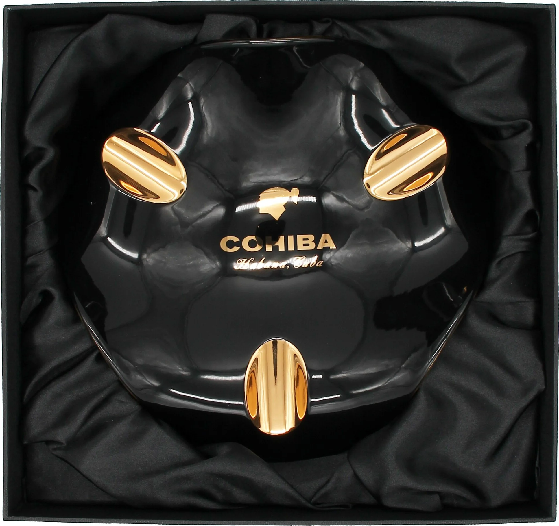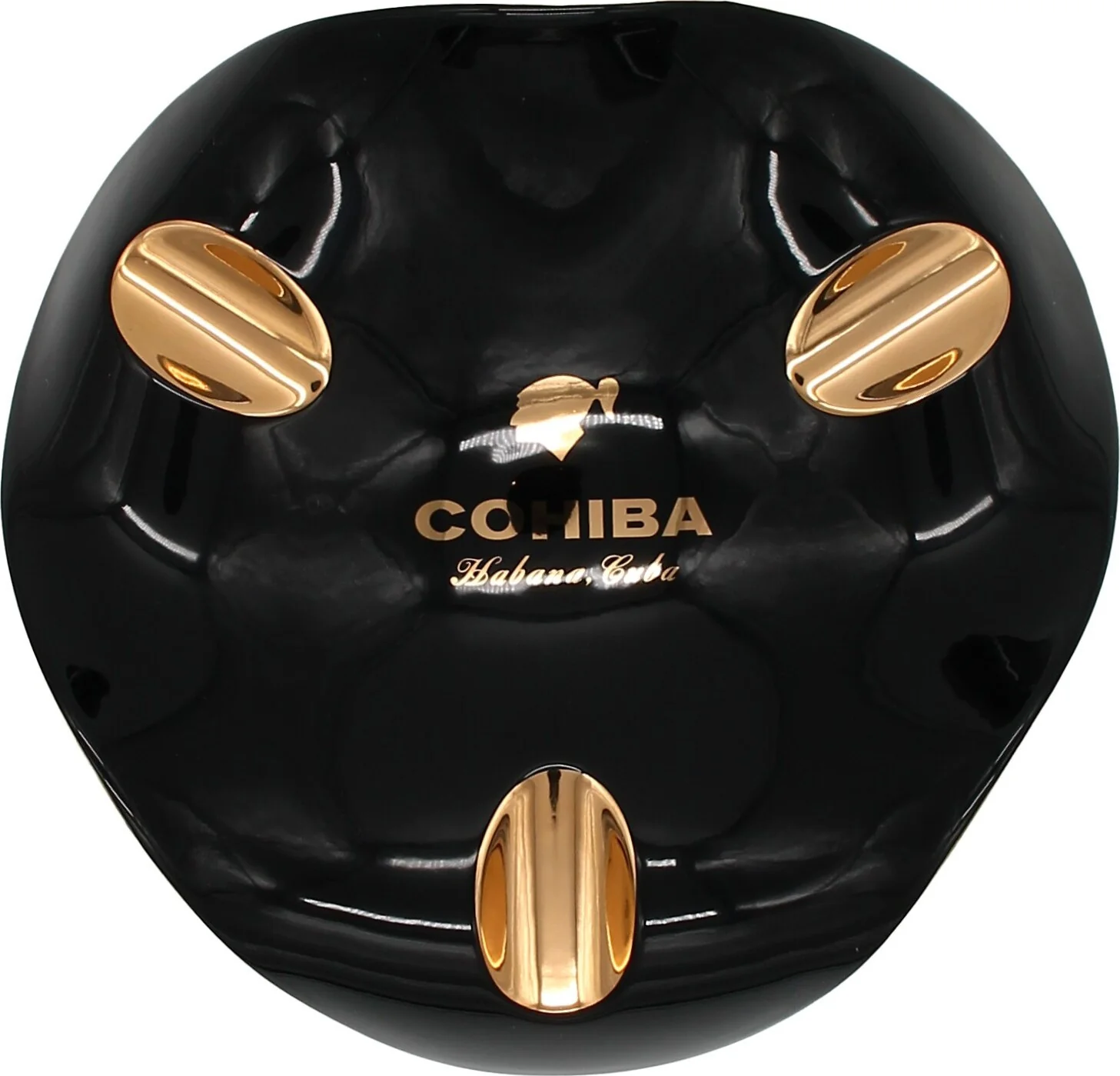 The ashtray was designed by Nelson Alfonso for Habanos S.A. The Cohiba logo in gold is prominently displayed in the center, emphasizing the piece's exclusivity and recognizability. The combination of black and gold, along with its elegant design, makes this ashtray a sophisticated and prestigious accessory.