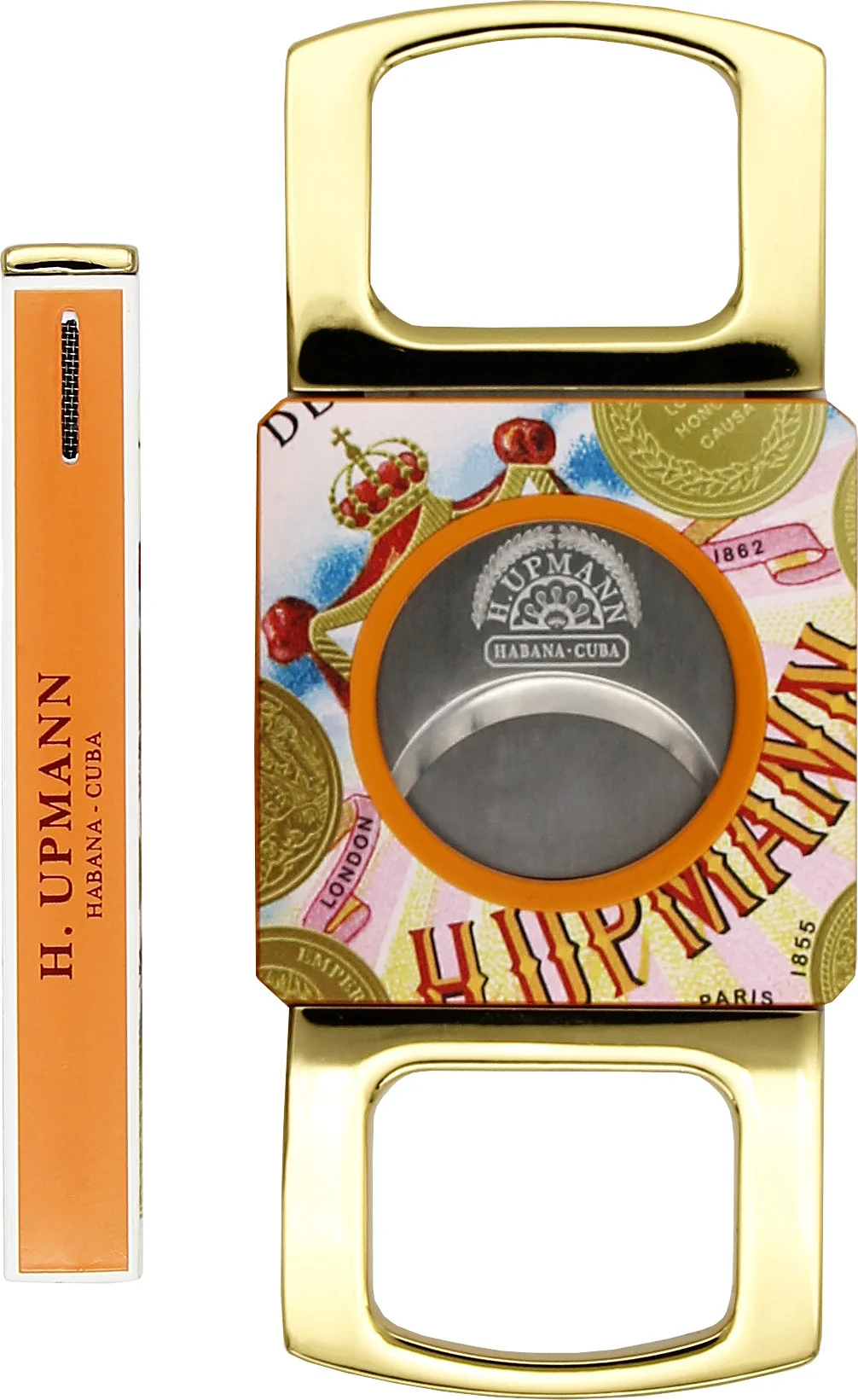 The orange H. Upmann logos are complemented by gleaming gold accents, giving both the lighter and cutter an exclusive appearance. The interplay of orange, gold, and high-quality craftsmanship makes this set an elegant and modern companion for every cigar aficionado.
