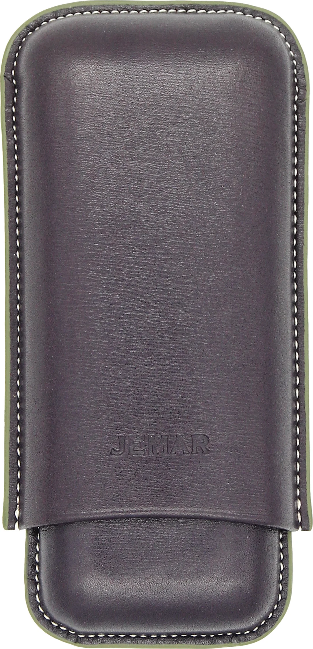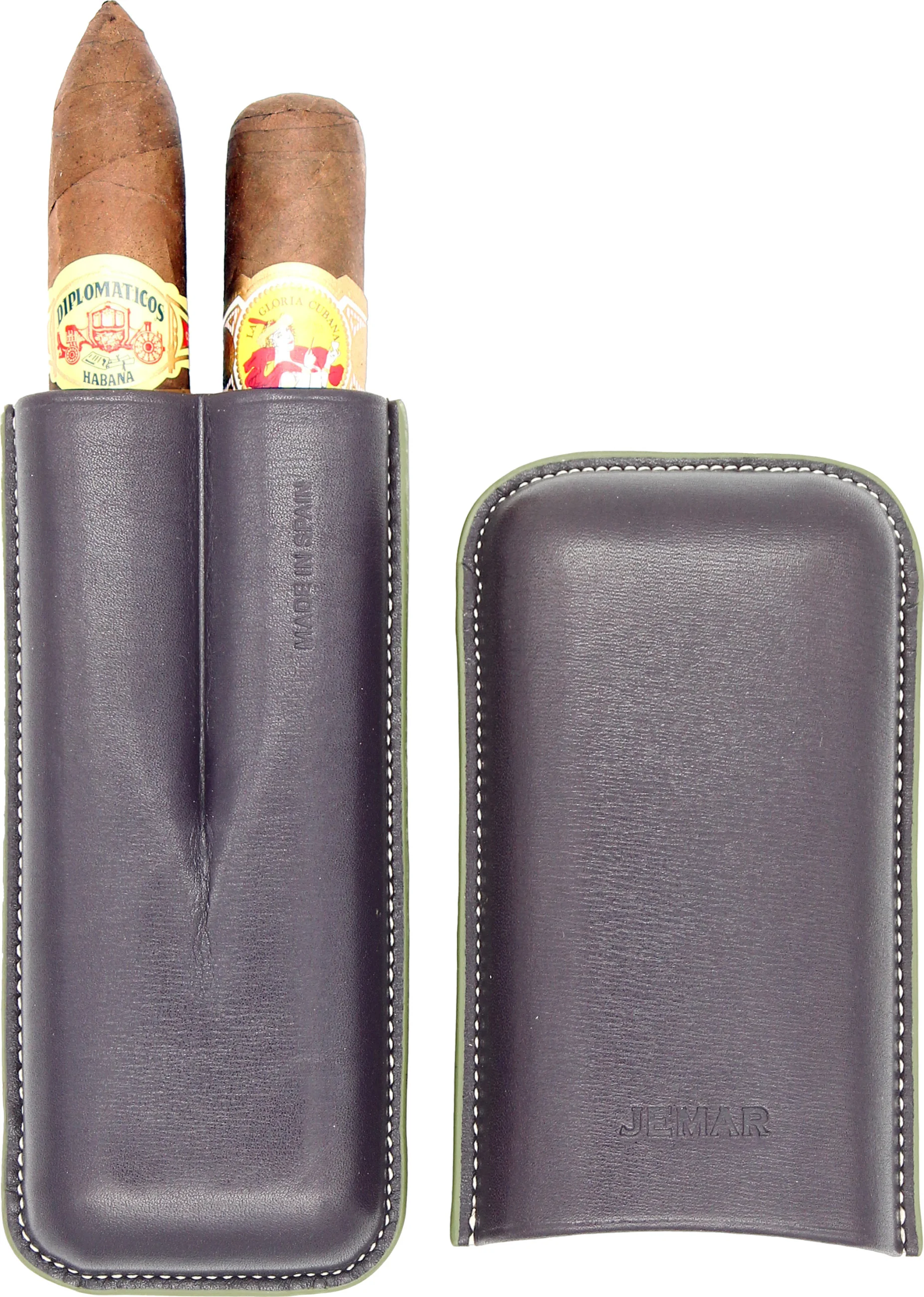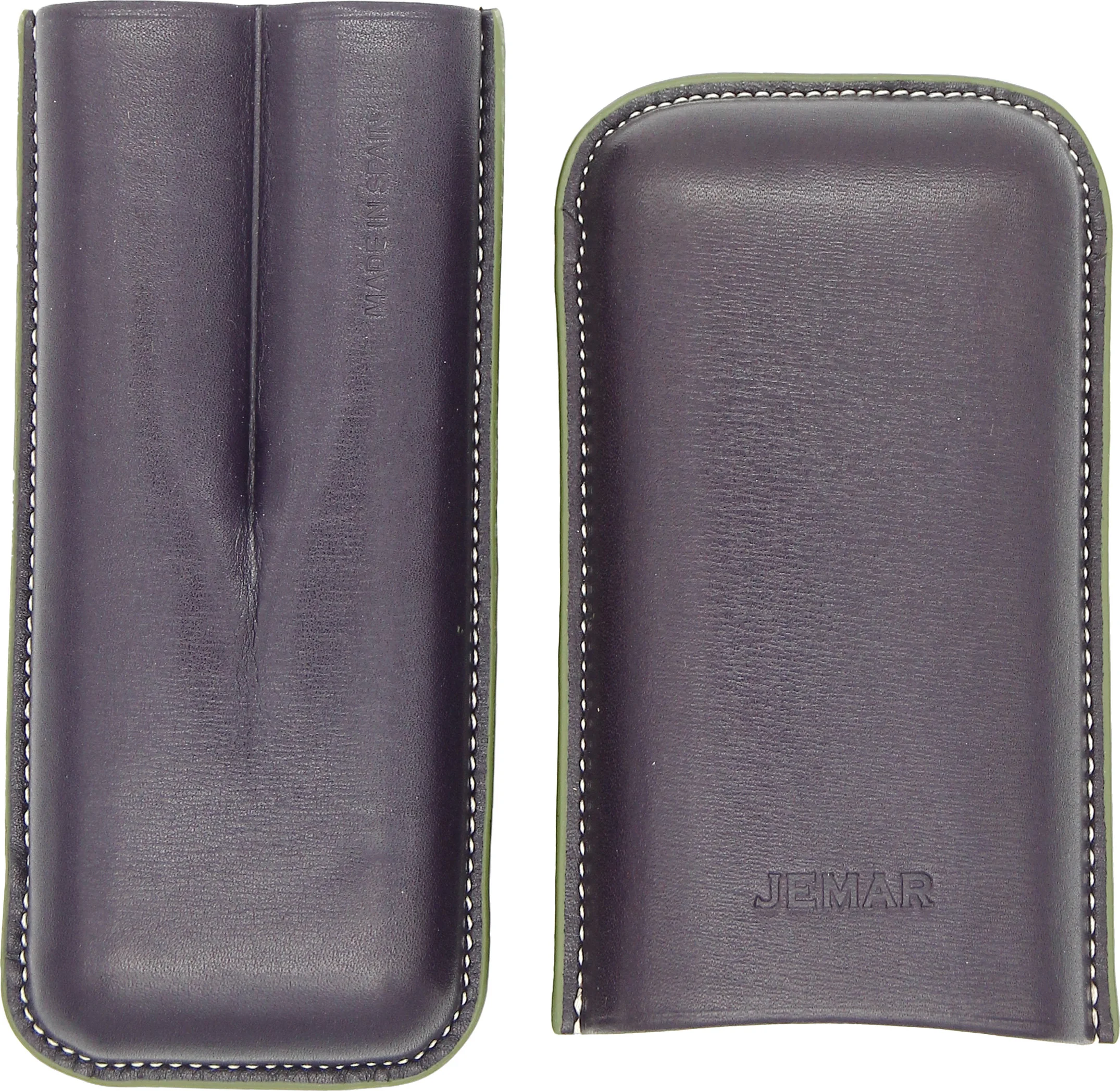 Jemar 深紫色雪茄皮套盒可装两支雪茄是一款为注重品质与工艺的雪茄爱好者设计的时尚配件。这款雪茄盒采用精致的茄子色真皮制成,带有浅色装饰缝线和绿色装饰边,其优雅和实用性,给人留下深刻印象。雪茄盒内部衬有浅色光滑皮革,不仅外观精致,还能为雪茄提供额外保护。