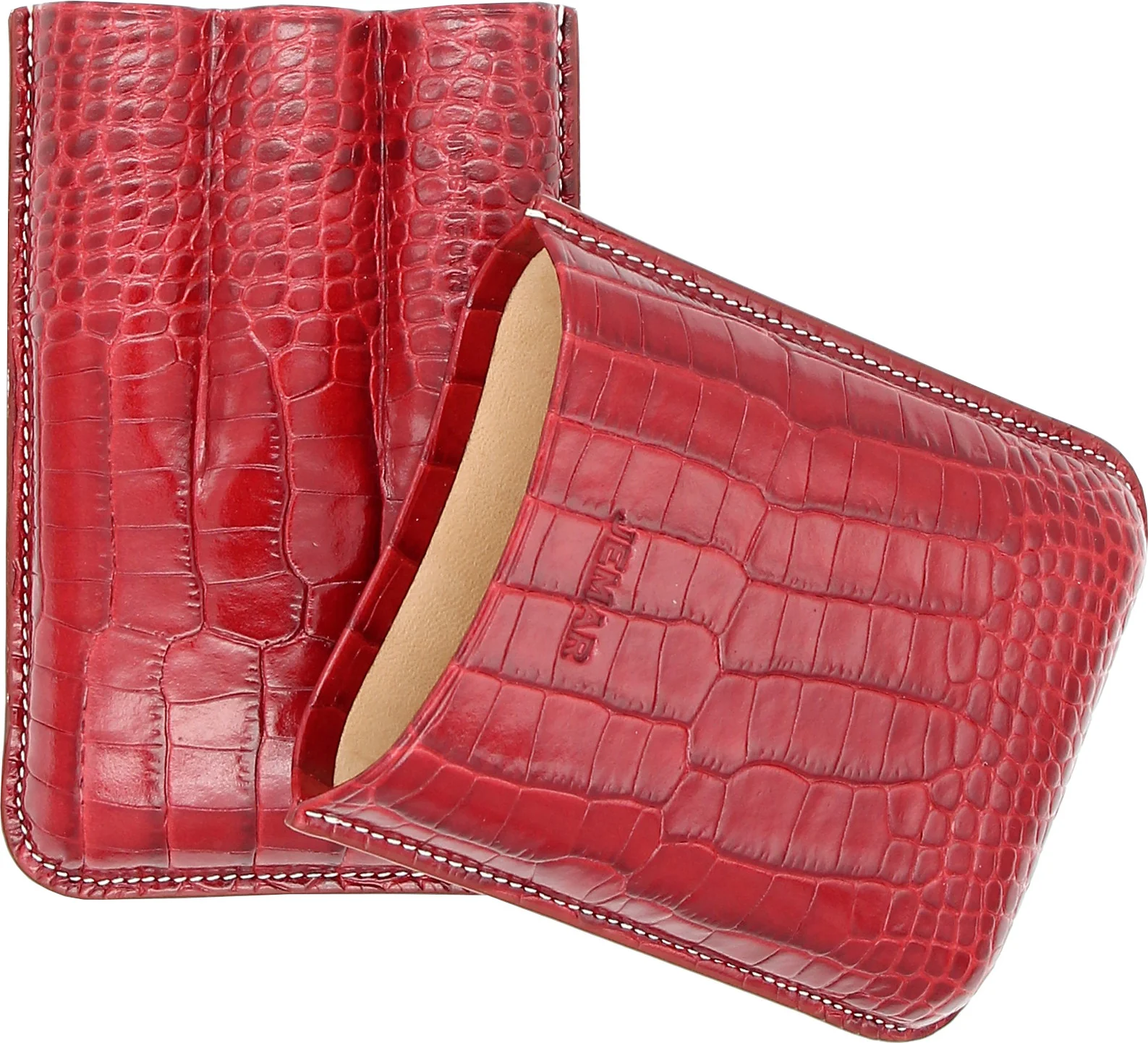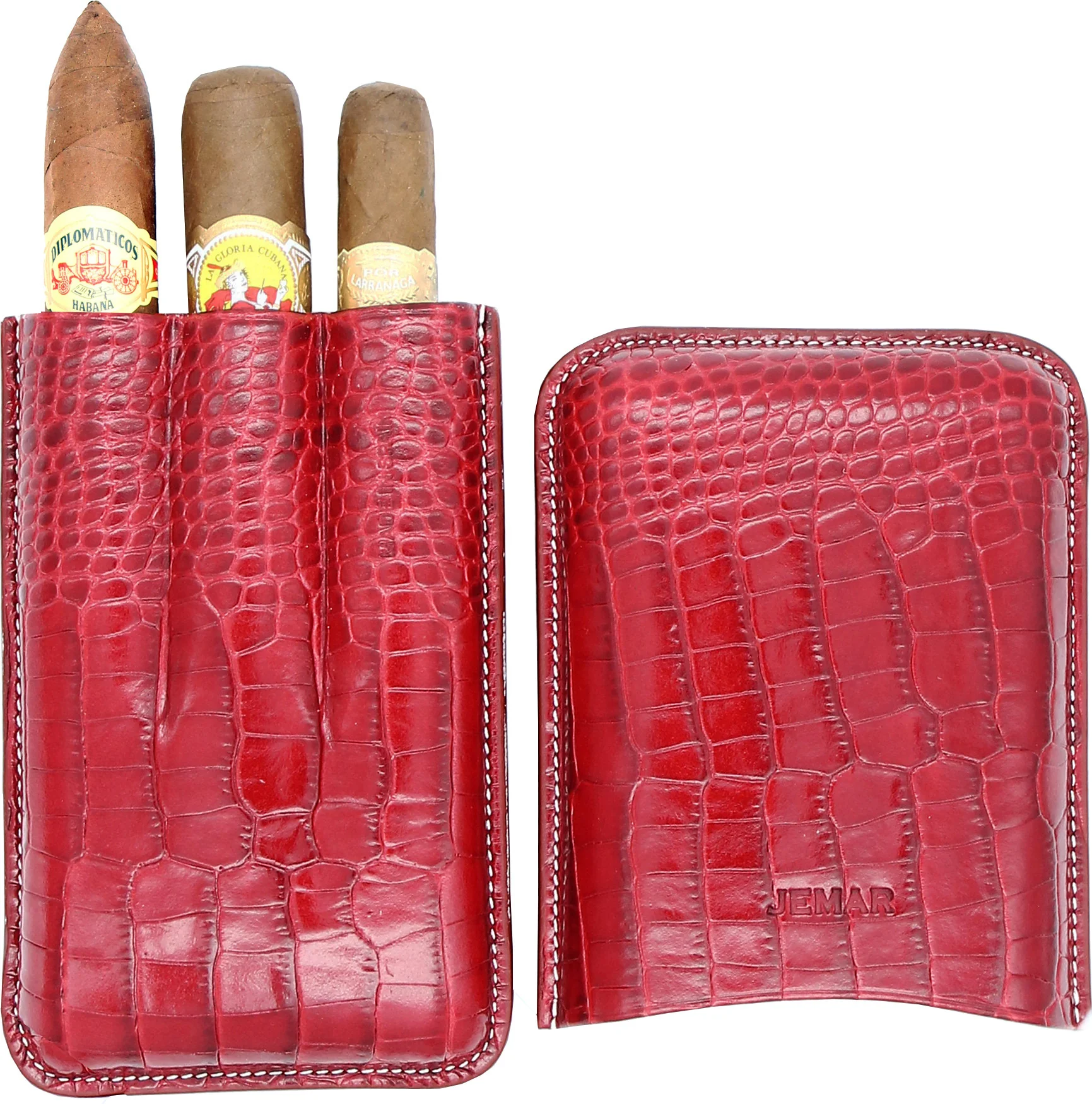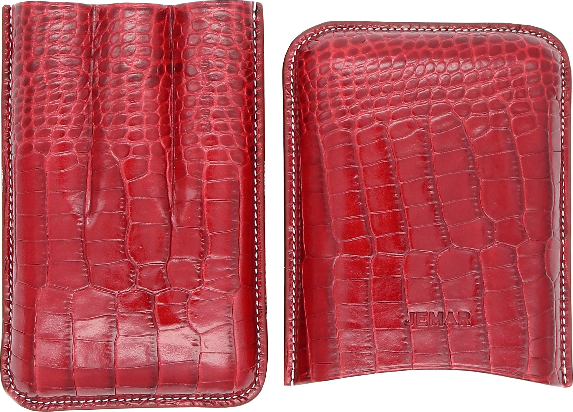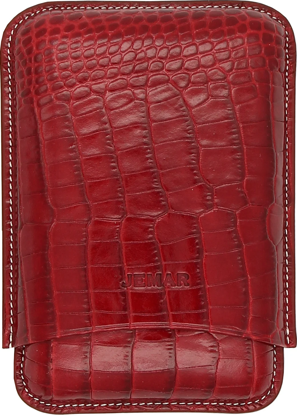 Jemar 雪茄皮套盒可装三支雪茄是一款为注重品质与工艺的雪茄爱好者设计的时尚配件。这款雪茄盒采用红色鳄鱼纹真皮制成,带有浅色装饰缝线,优雅实用,令人印象深刻。皮套内衬为浅色光滑皮革,不仅外观精致,还能为雪茄提供额外保护。