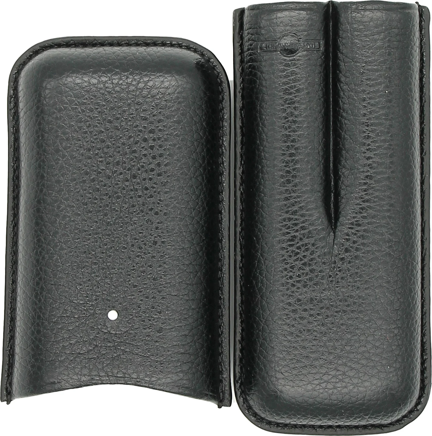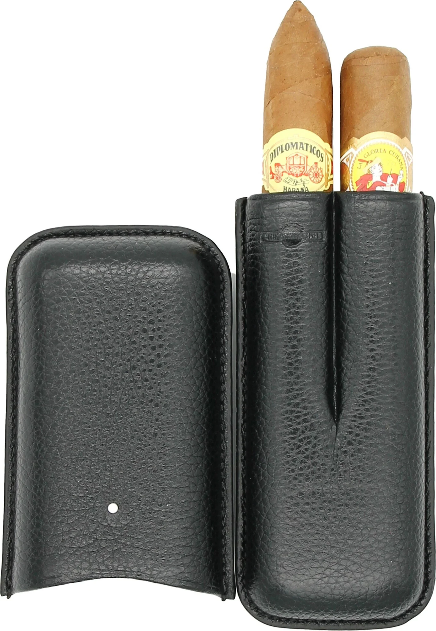 Inside, the case offers space for two cigars of different sizes. Practical notches ensure secure hold during transport. The interior is lined with soft leather and reliably protects the cigars.
